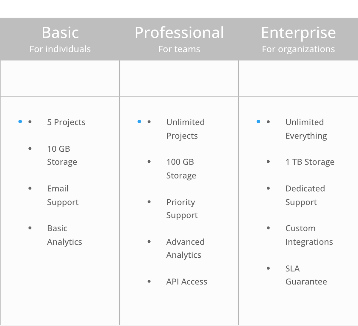 - Comparing multiple pricing tiers or service packages side by side