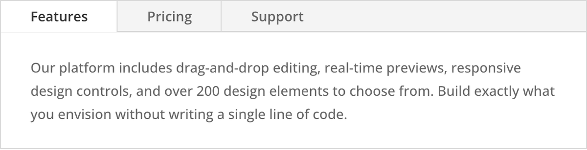 - Service Tiers or Pricing Plans — Display different pricing plans or service levels in their own tabs, letting visitors compare options by switching between panels without scrolling.